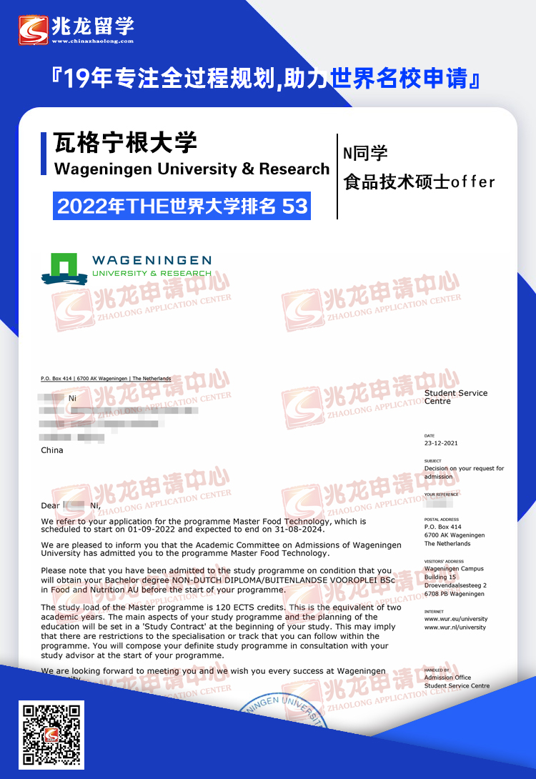 恭喜兆龙留学成功为N同学申请到2022泰晤士世界大学排名第53位的瓦格宁根大学食品技术硕士offer!以下是学生offer分享,在此祝他留学之路一切顺利!