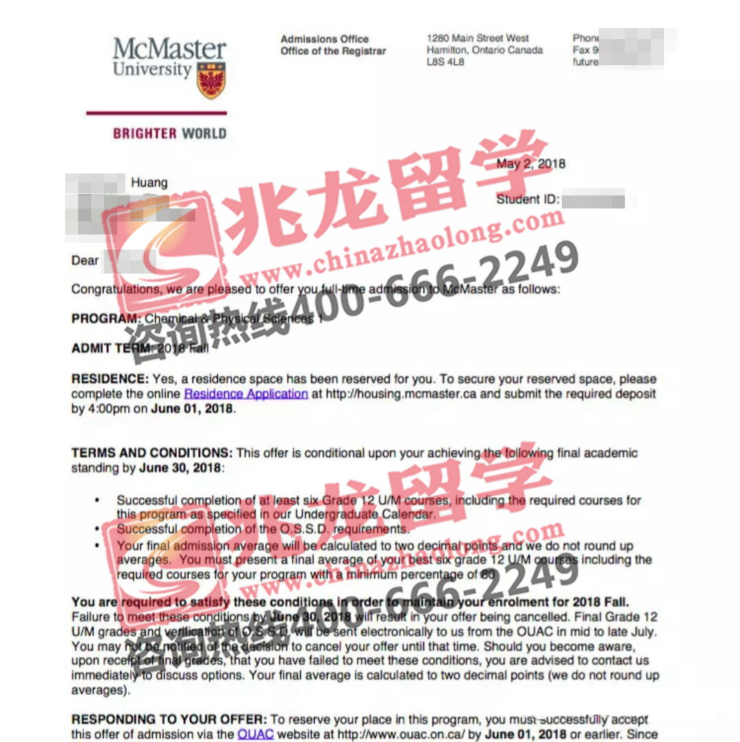 经过兆龙留学加拿大部老师的努力,成功为黄同学申请到加拿大麦克马斯特大学化学与物理科学专业录取offer,以下是学生的offer分享,在此祝他留学之路一切顺利!更多加拿大留学及签证问题请拨打兆龙留学咨询热线400-666-2249!