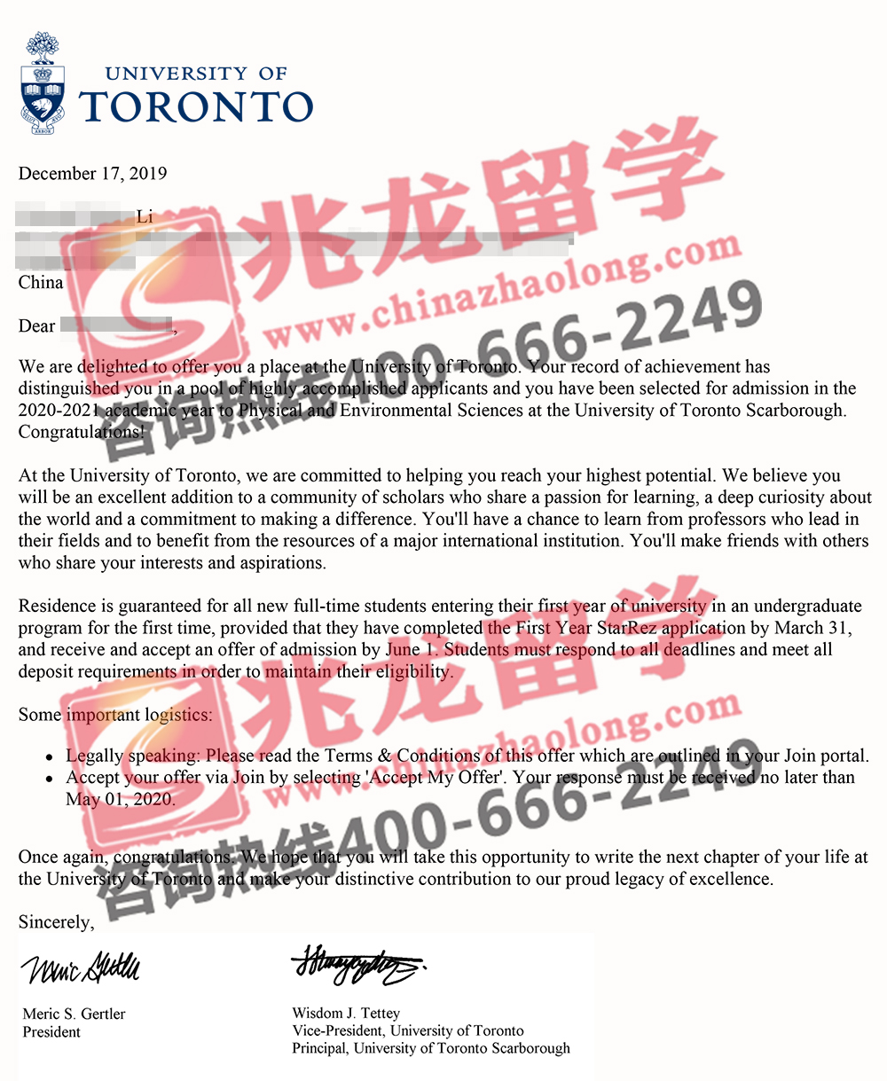 经过兆龙留学加拿大部老师的努力,成功为李同学申请到加拿大多伦多大学物理环境科学专业本科offer,祝李同学在多伦多大学能获得更好的提升。更多加拿大留学问题请拨打兆龙留学咨询热线400-666-2249!