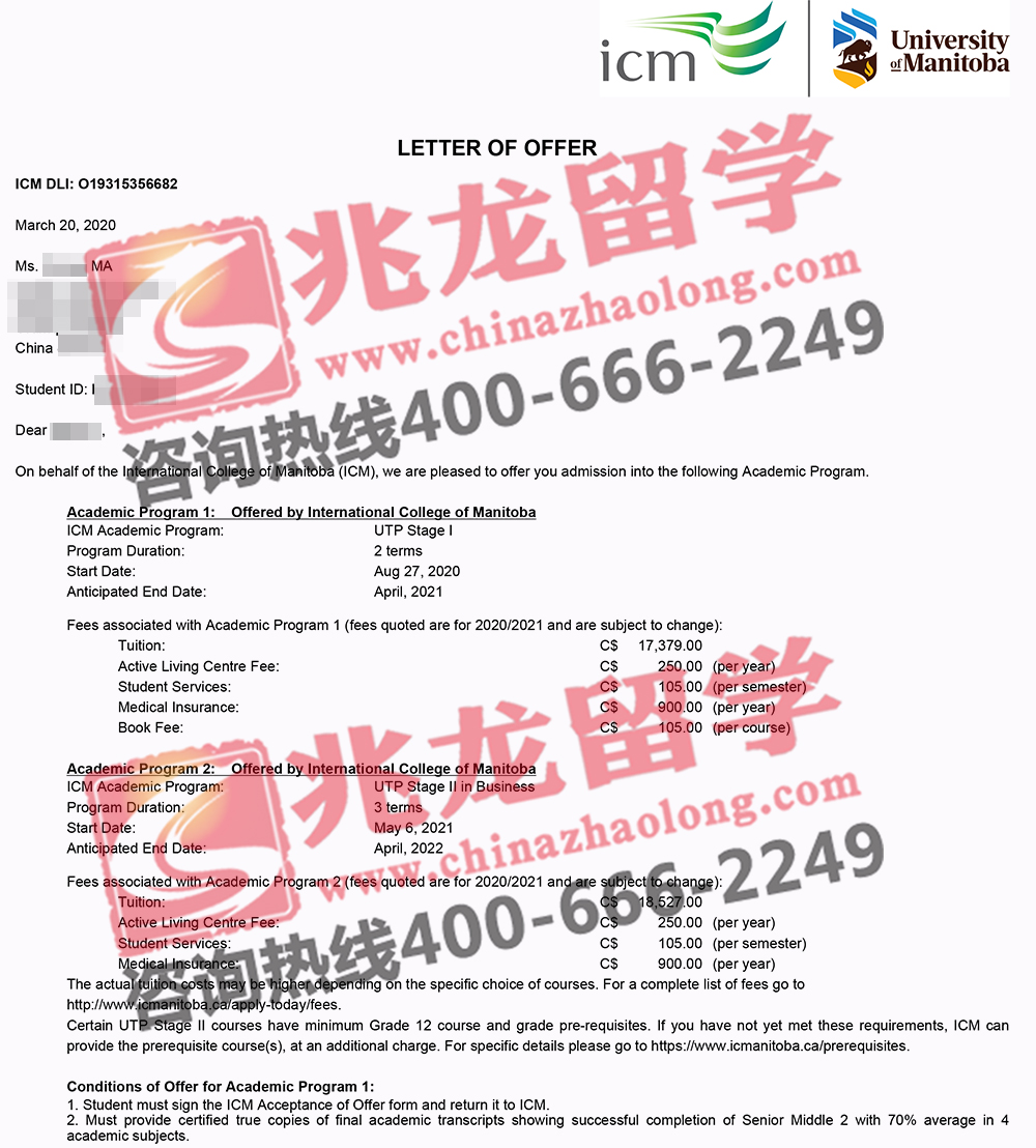 经过兆龙留学加拿大部老师的努力,成功为马同学申请到加拿大曼尼托巴国际学院ICM录取offer,以下是学生的offer分享,在此祝他留学之路一切顺利!更多加拿大留学及签证问题请拨打兆龙留学咨询热线400-666-2249!