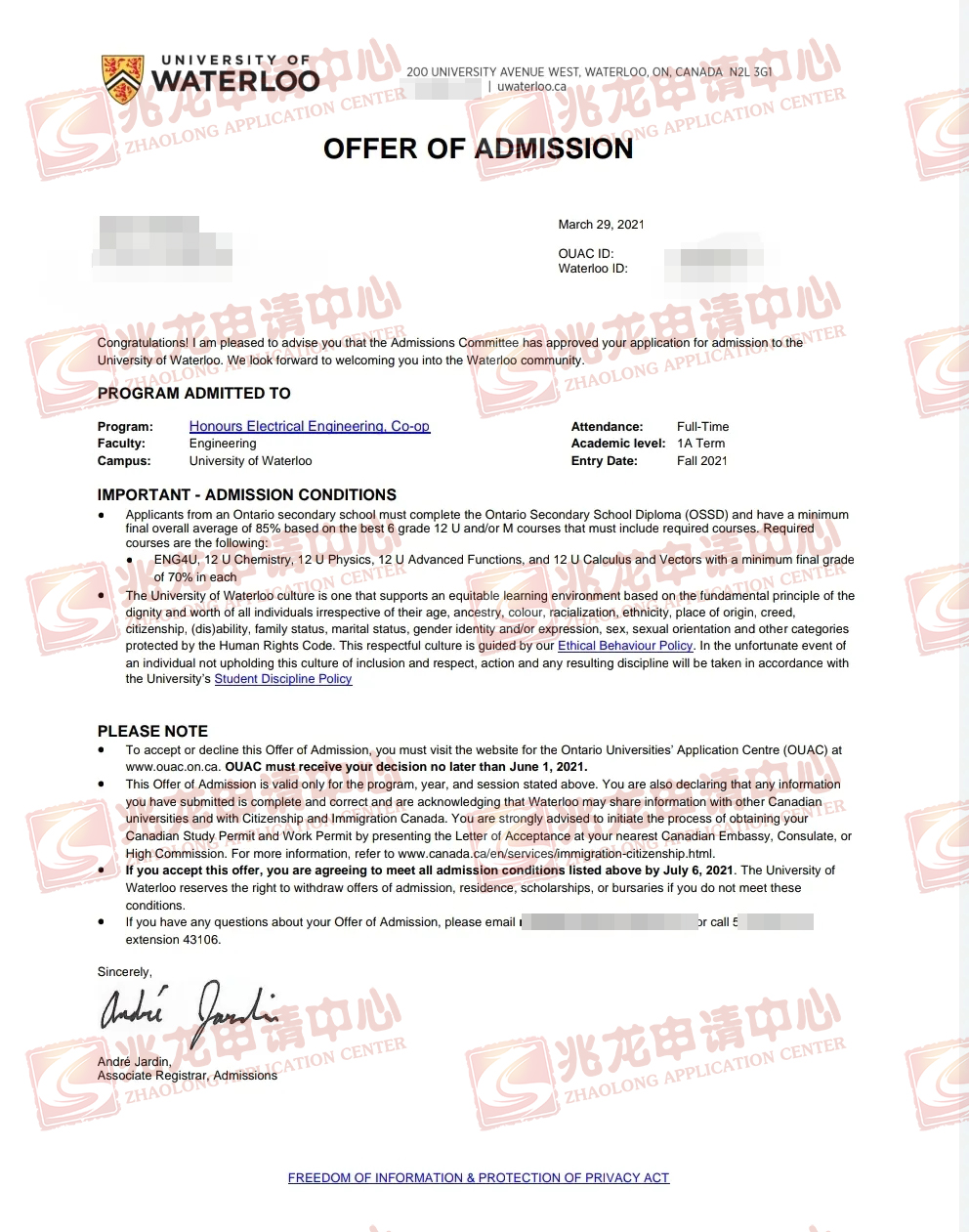 恭喜兆龙留学成功为李同学申请到加拿大滑铁卢大学电子工程专业本科offer!