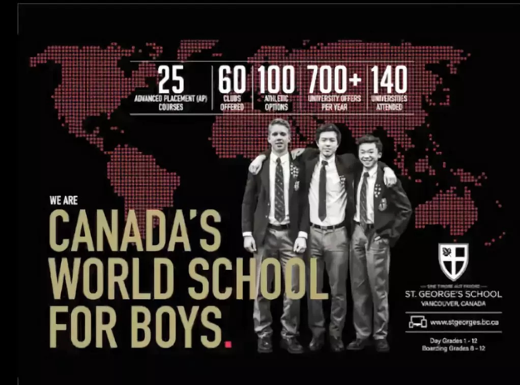 建立于1930年的圣乔治(St. George's School,以下简称SGS) 是一所历史悠久、声名卓著的重量级男子私立学校。全球诸多社会名流毕业于该校,华人首富李嘉诚的儿子、以及现在炙手可热的马云爸爸的亲儿子就是其中之二。加拿大及中国地区众多商界名人子弟,现任BC省长简蕙芝女士的儿子亦在此学习。