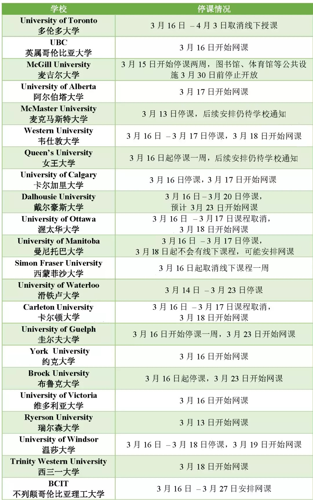 看完疫情的最新进展,接下来我们来看看加拿大各大高校针对疫情公布的最新停课及网上授课安排。截止至3月15日为止,几乎所有加拿大主流院校都公布停课安排,大部分学校将安排线上授课,同学们可以安心留在学校宿舍或公寓准备上网课了~