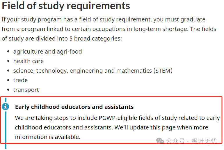 根据11月8日加拿大移民局(IRCC)官网更新的消息显示,正在把早教专业(Early Child Educators and Assistants)列入可以申请毕业工签的范畴中。