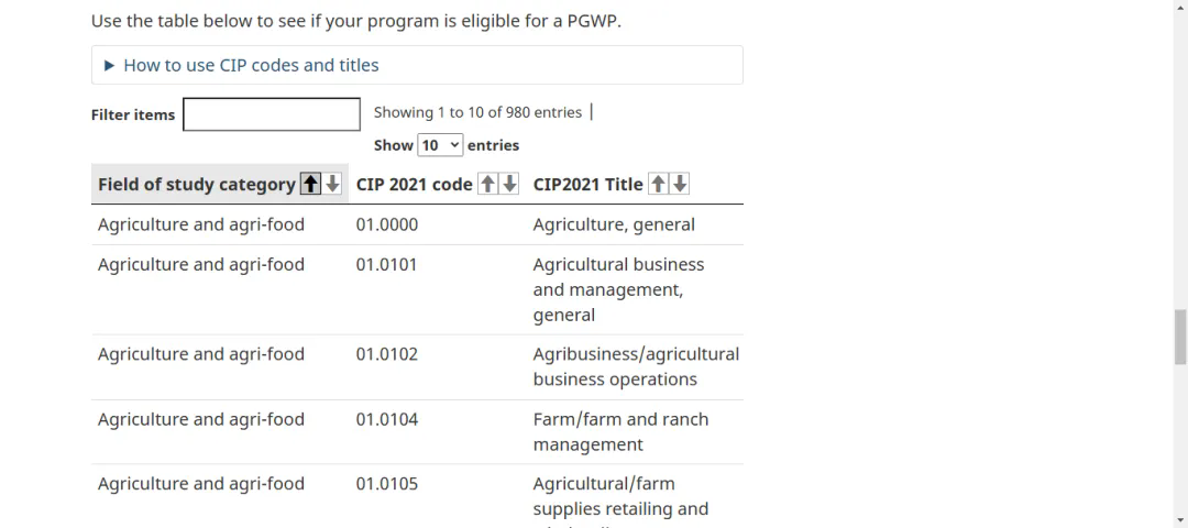 你就能直接在加拿大移民部官网上看到最新的、符合申请毕业工签的、加拿大College的专业课程CIP完整名单!这里列出的是目前所有可以申请毕业工签的College课程!
