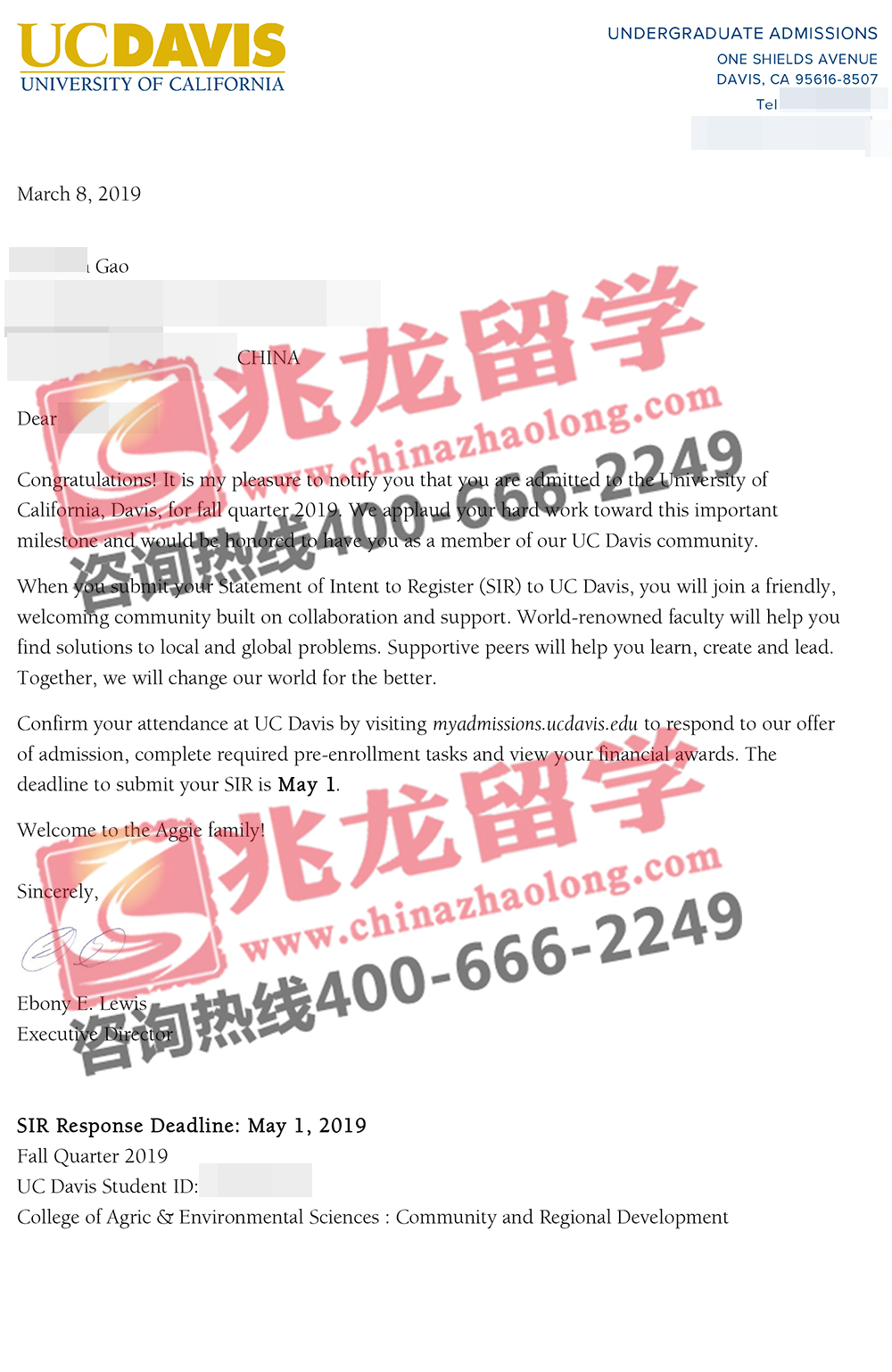 经过兆龙留学美国部老师的努力,成功为高同学申请到美国加州戴维斯分校社区与地区发展专业本科offer,祝高同学在加州戴维斯分校能获得更好的提升,为将来在美国留学读硕士做最好铺垫。更多美国留学申请信息请拨打兆龙留学咨询热线400-666-2249。