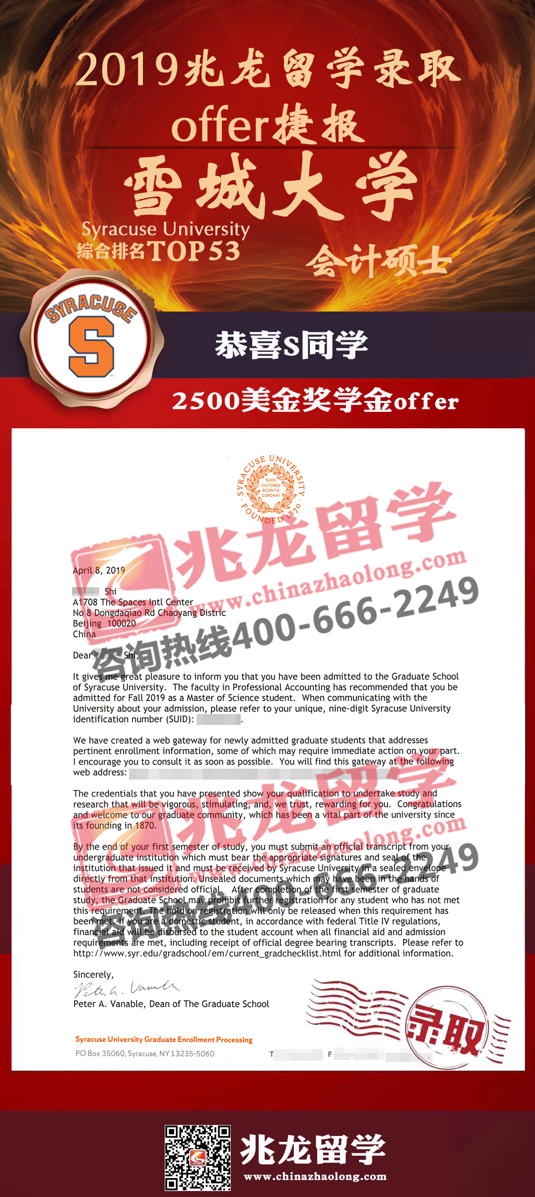 经过兆龙留学美国部老师的努力,成功为史同学申请到美国雪城大学会计硕士2500美元奖学金offer,以下是学生offer分享,在此祝他留学之路一切顺利!更多美国留学申请信息请拨打兆龙留学咨询热线400-666-2249。
