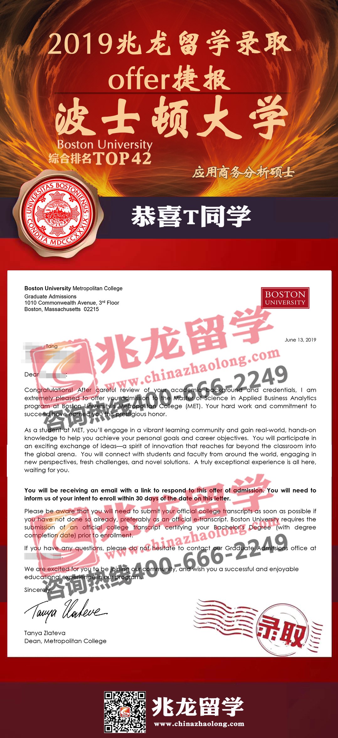 经过兆龙留学美国部老师的努力,成功为汤同学申请到美国波士顿大学应用商务分析专业硕士offer,相信波士顿大学将会带给你很多美国留学的美好回忆。祝T同学在波士顿大学能获得更好的提升。
