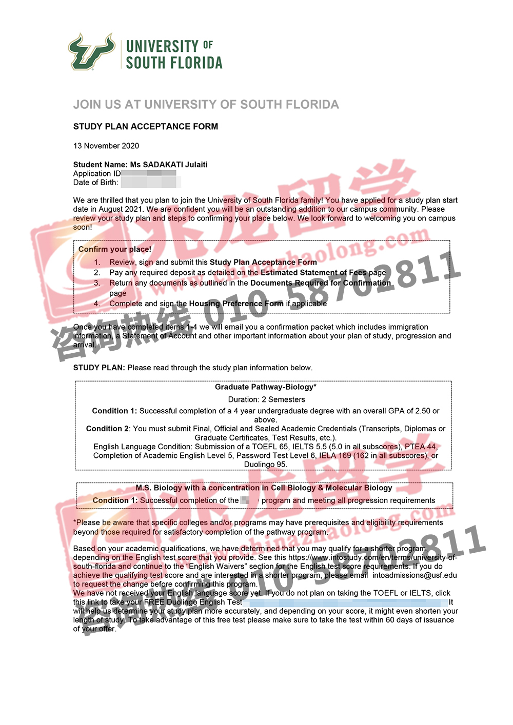 恭喜兆龙留学成功为萨达卡提同学申请到美国南佛罗里达大学生物学硕士offer!