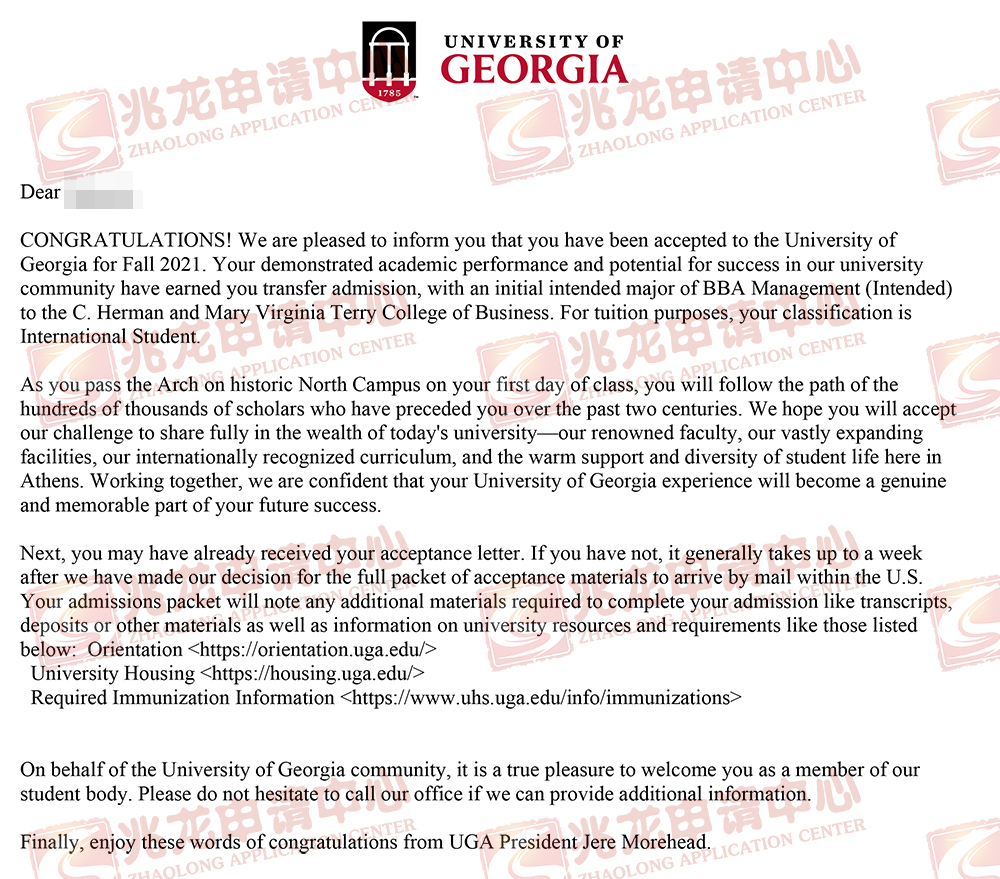 恭喜兆龙留学成功为周同学转学美本,申请到美国综合排名47位的佐治亚大学offer!