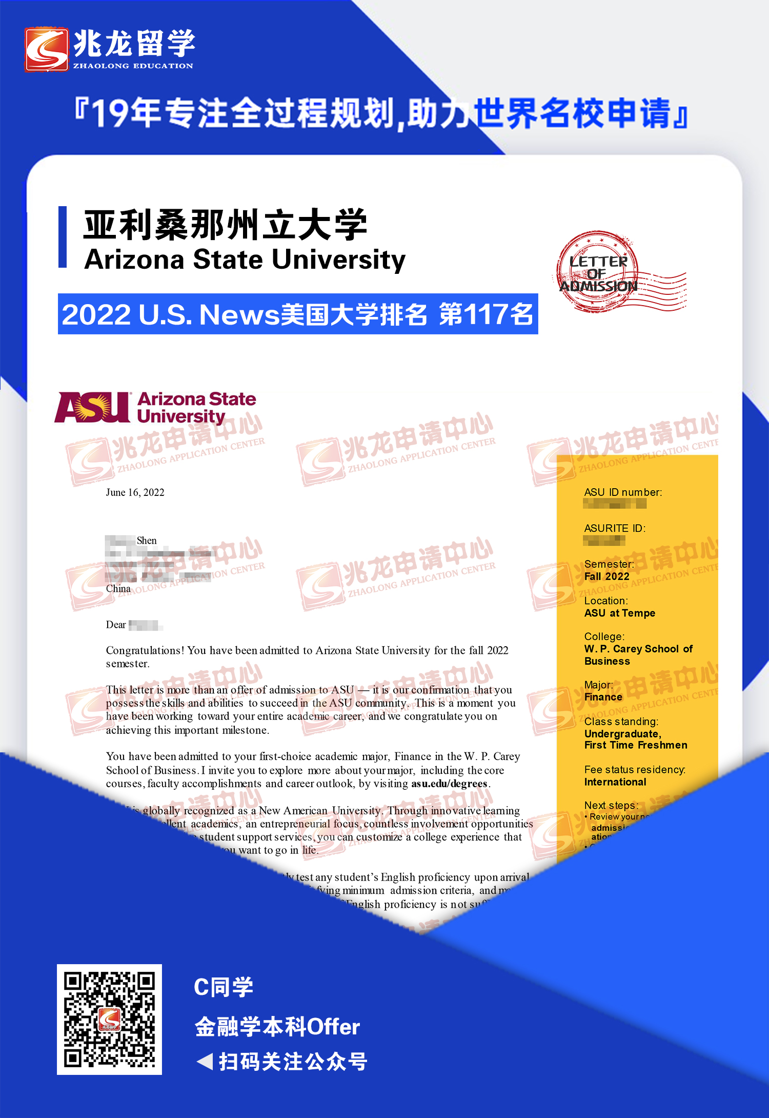 恭喜兆龙留学成功为C同学申请到美国亚利桑那州立大学金融学专业本科offer!