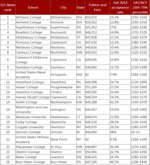 美国新闻与世界报道US News发布了2016全美最佳大学、最佳文理学院、最佳世界大学排行榜。虽说有很多机构对大学进行排名,但其中兼具权威和影响力的便是由US News每年发布的大学排名,也是大家申请大学时选校选专业比较常用的。下面兆龙留学小编跟大家分享一下2016US News美国文理学院排名!