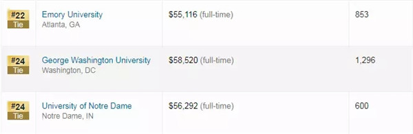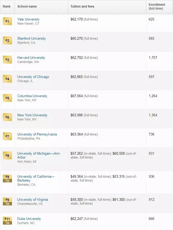 在前十当中,去年并列第二的哈佛和斯坦福,今年分出了高低,斯坦福力压哈佛排名第二,哈佛屈居第三。同样的情况也发生在芝大和哥大身上,去年它俩并列第四,今年芝大稍稍领先,排名第四,哥大稍落下风,排名第五。另外,今年跟去年有一个相同点,就是并列的院校有很多。