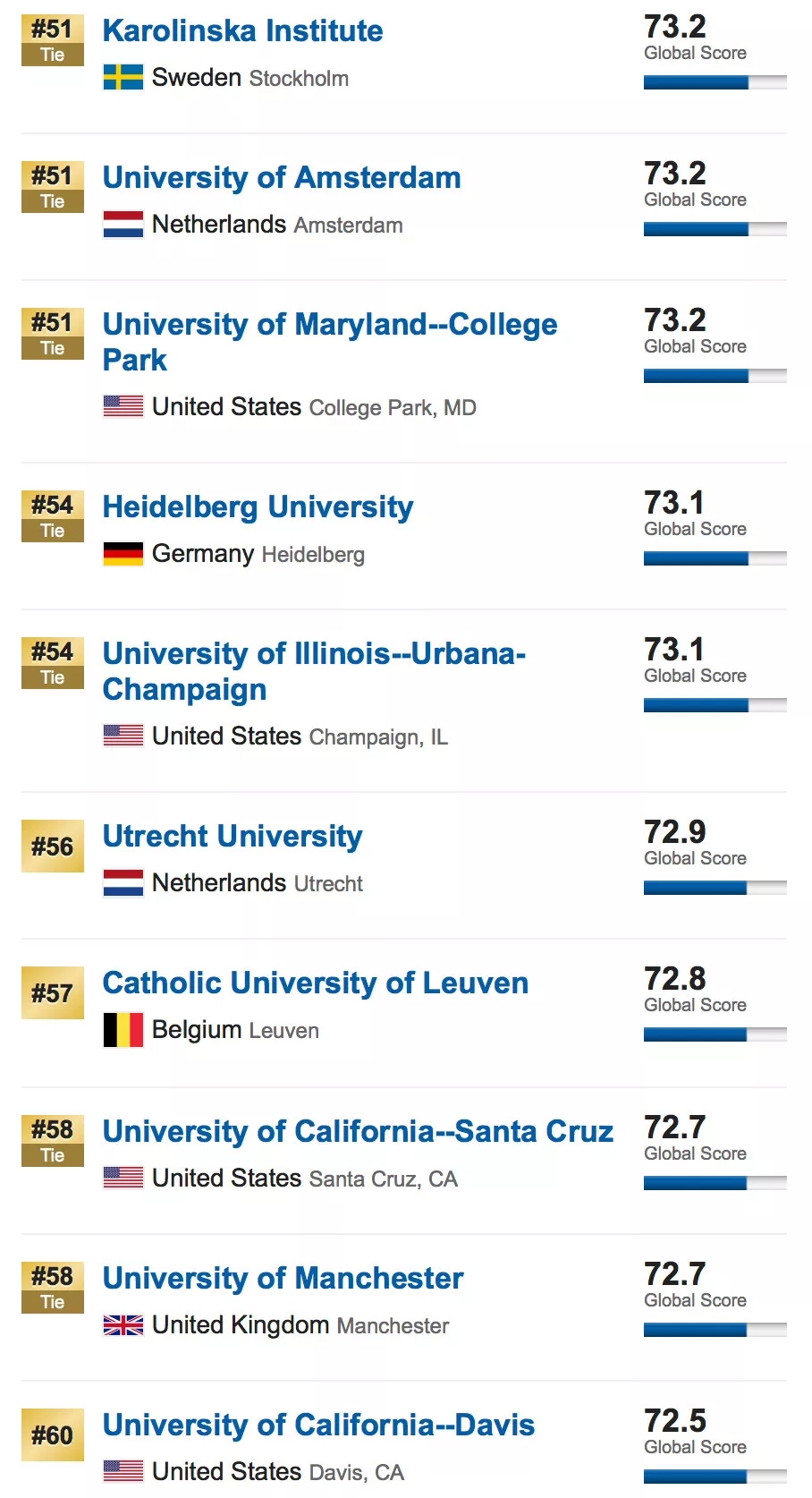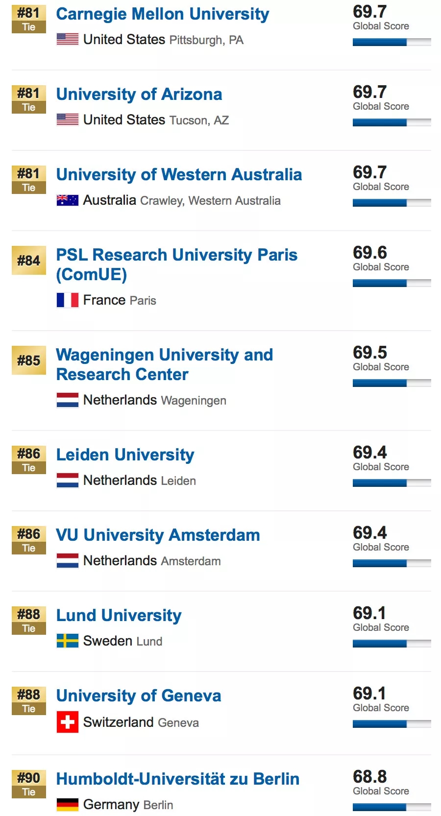 和去年的榜单一样,哈佛、MIT依然位居冠、亚军。前9名的学校名次没有变化。