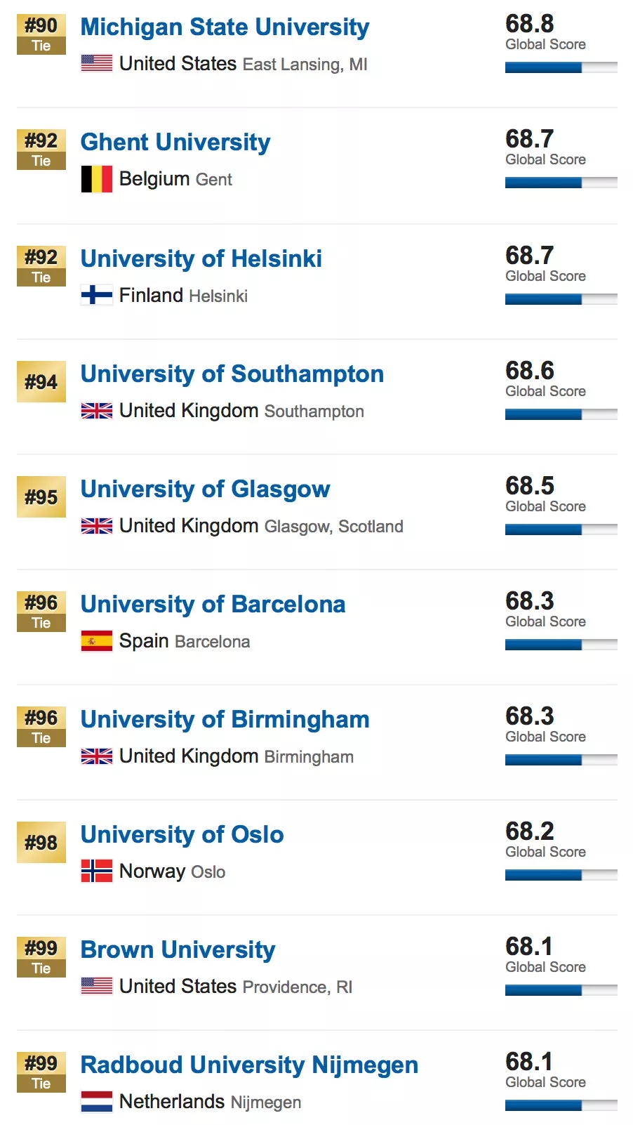 Top100里面美国46所!英国12所!中国大陆2所,清华大学冲进Top50,北京大学第68位!中国香港与台湾都是“0”,表现最好的香港大学第103位!国立台湾大学第174位!