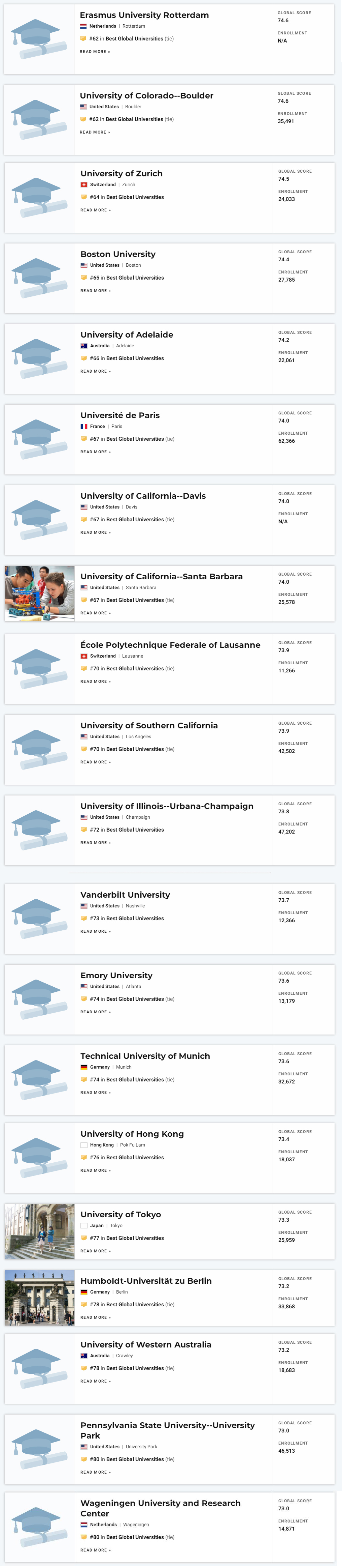 ● 纵观亚洲地区,新加坡国立大学也跻身Top30,排名第29,南洋理工从38升至33位。另外,在QS、THE比较优秀的日本东京大学,在USnews世界大学排名第77。