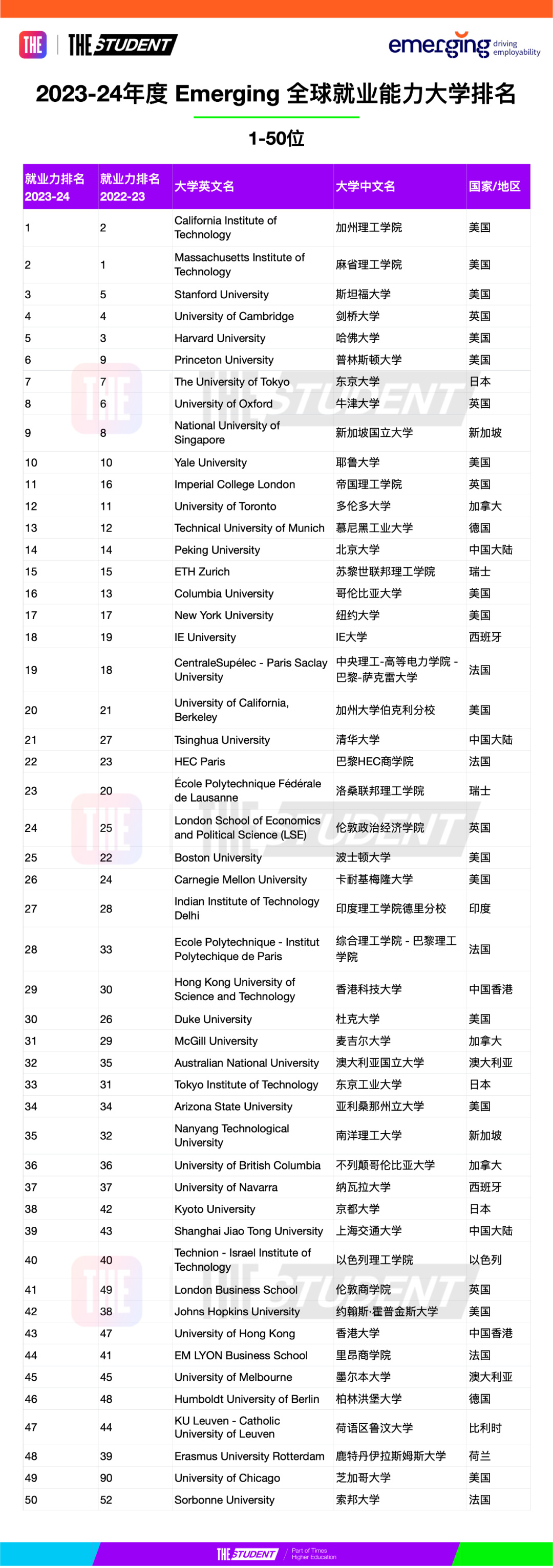 近期,泰晤士高等教育(Times Higher Education,简称THE)发布了2023-24年度全球就业能力大学排名!该排名和调查由法国咨询公司Emerging收集数据,并与泰晤士高等教育共同发布,是根据雇主的评估、知识和期望,揭示全世界在培养就业能力方面,表现最优秀的250所大学的唯一排名和调查。