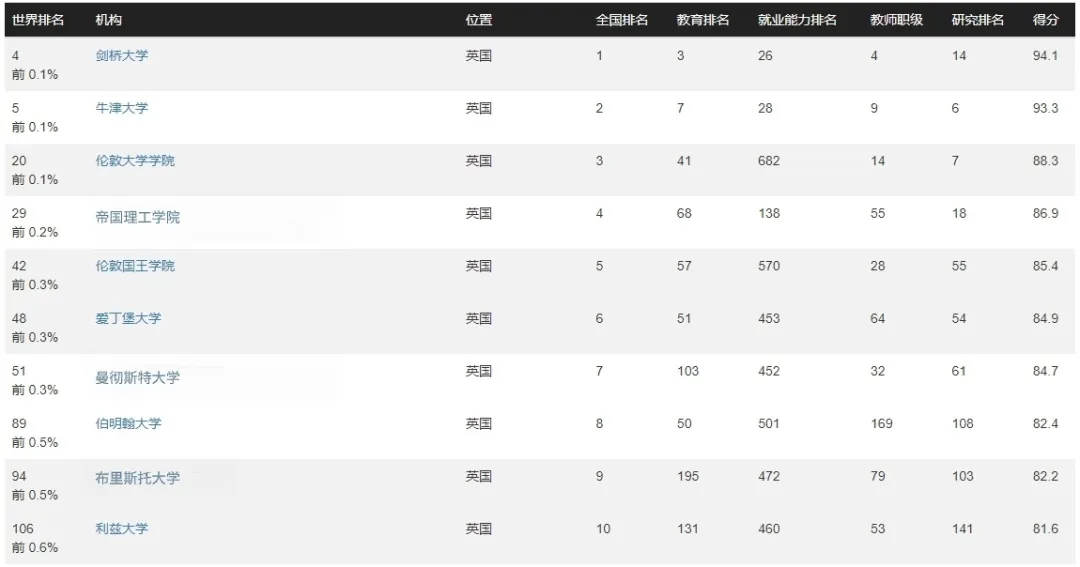 英国共有92所院校上榜,剑桥大学、牛津大学进入世界前5;TOP20中占3所,数量仅次于美国;TOP100中占9所,与去年一致。