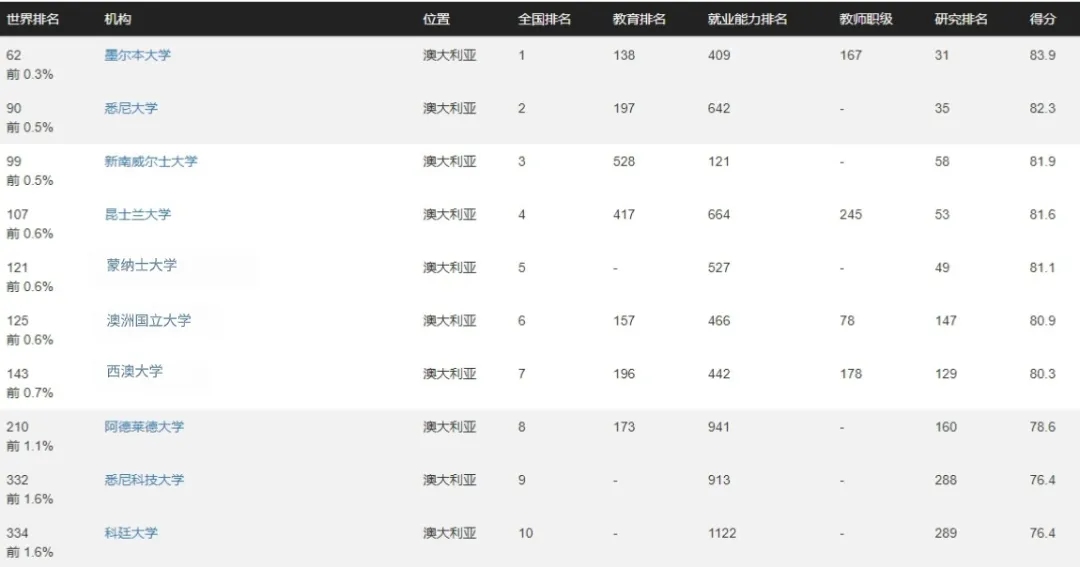 澳大利亚共有39所院校上榜,TOP100中占3所,分别是墨尔本大学、悉尼大学、新南威尔士大学。除阿德莱德大学外,其他“八大”院校均进入世界TOP150。