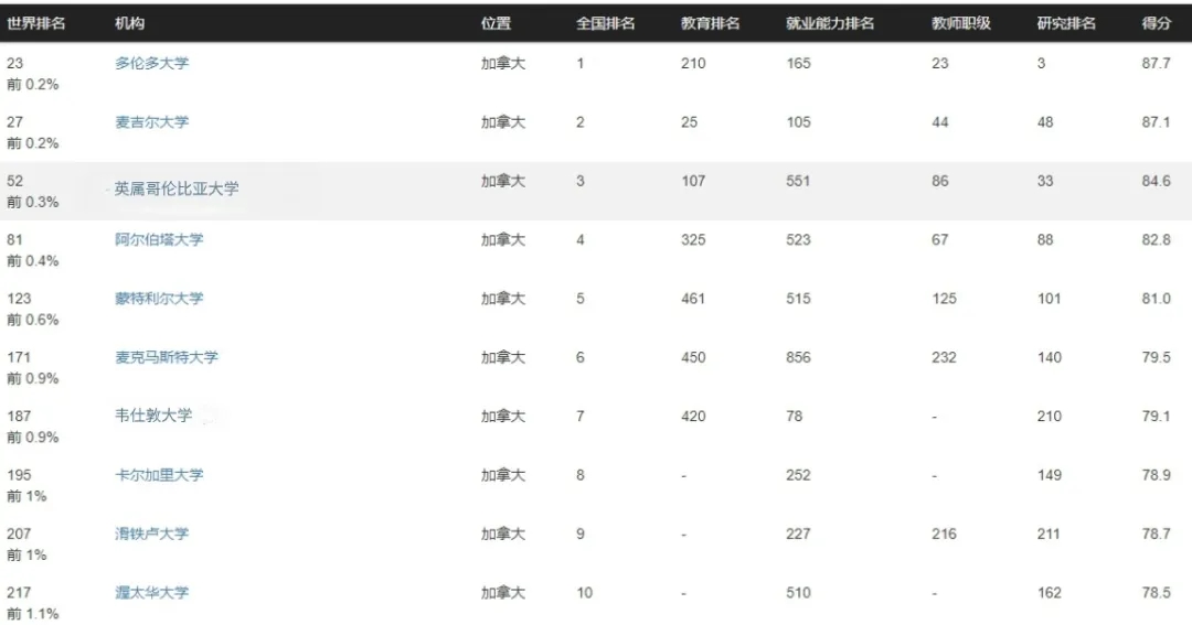 加拿大有39所院校上榜,TOP100中占4所,分别是多伦多大学、麦吉尔大学、英属哥伦比亚大学、阿尔伯塔大学。多伦多大学发挥稳定,以世界第23的成绩,继续蝉联加拿大第一的宝座。