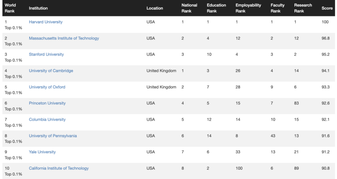普林斯顿大学、哥伦比亚大学、宾夕法尼亚大学、耶鲁大学、加州理工学院位列第6-10。