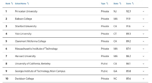 ●在本年度榜单中,公立院校的表现突出,加州大学伯克利分校(第 8 名)和佐治亚理工学院(第 9 名)双双名列十强,相比之下,去年只有两所公立院校进入二十强。