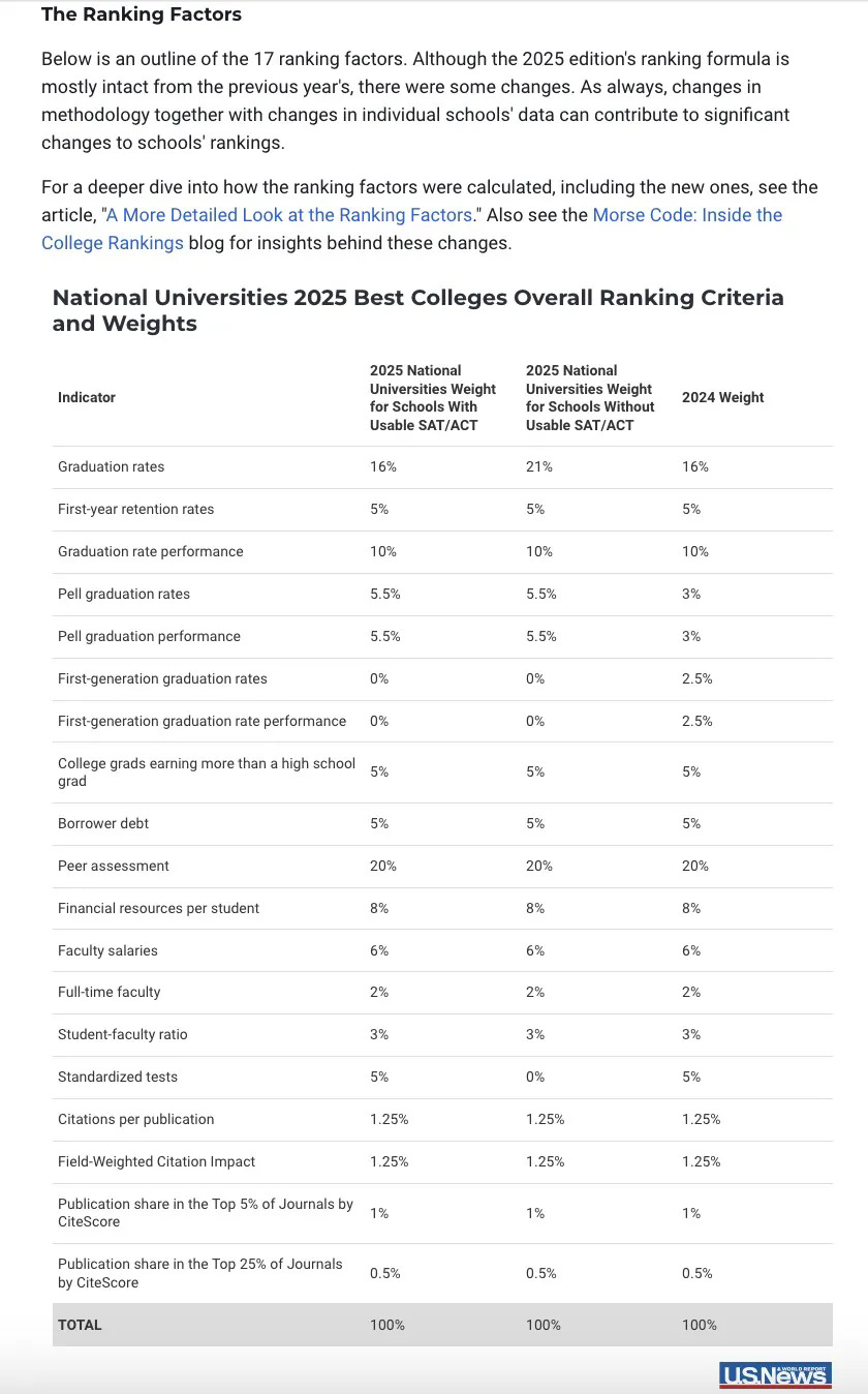 整体变化不大,在最新2025全美最佳大学排名方法中,删除了第一代学生的六年毕业率,取而代之的是佩尔格兰特毕业率。