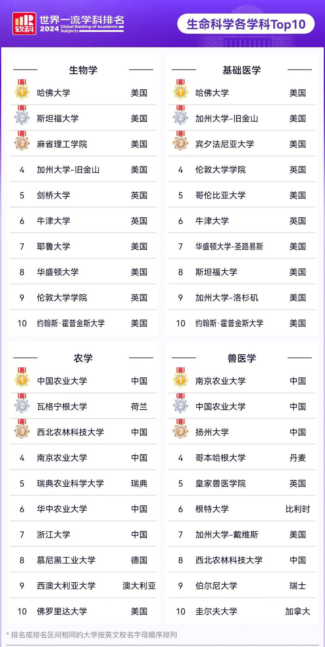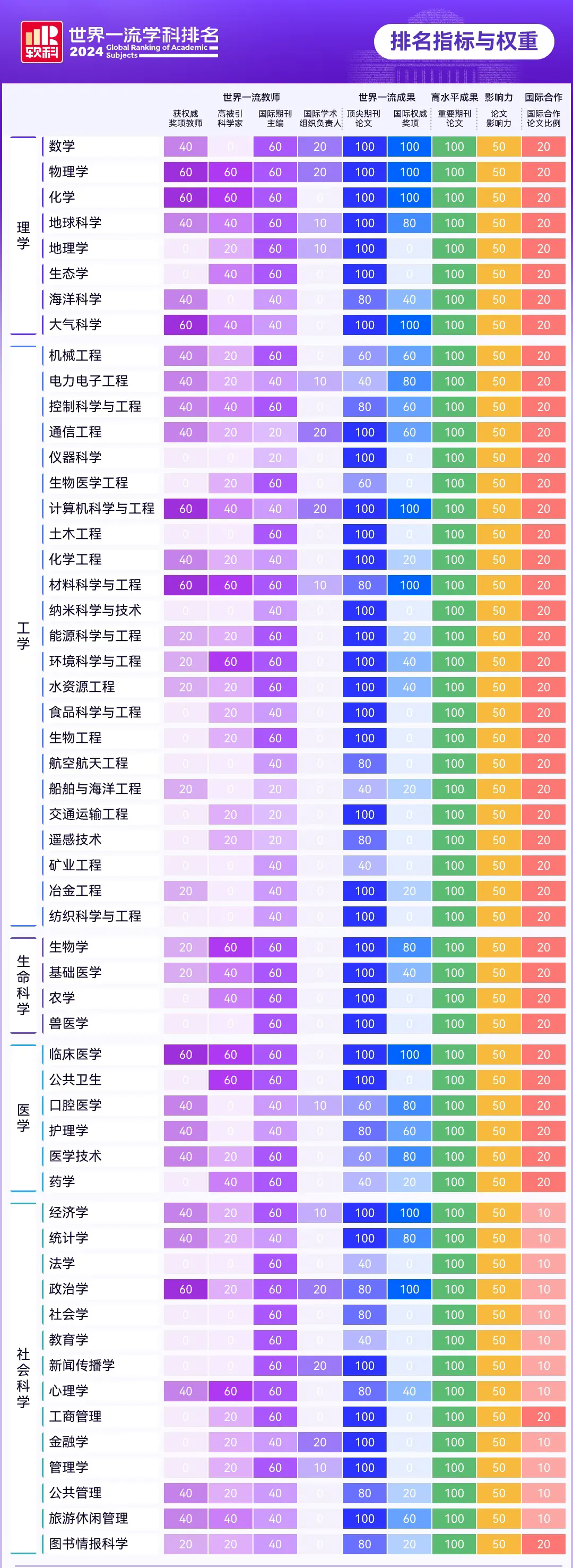 2024年排名覆盖55个学科,涉及理学、工学、生命科学、医学和社会科学五大领域。此次排名的对象为全球3000余所大学,共有来自96个国家和地区的1900余所高校最终出现在各个学科的榜单上。