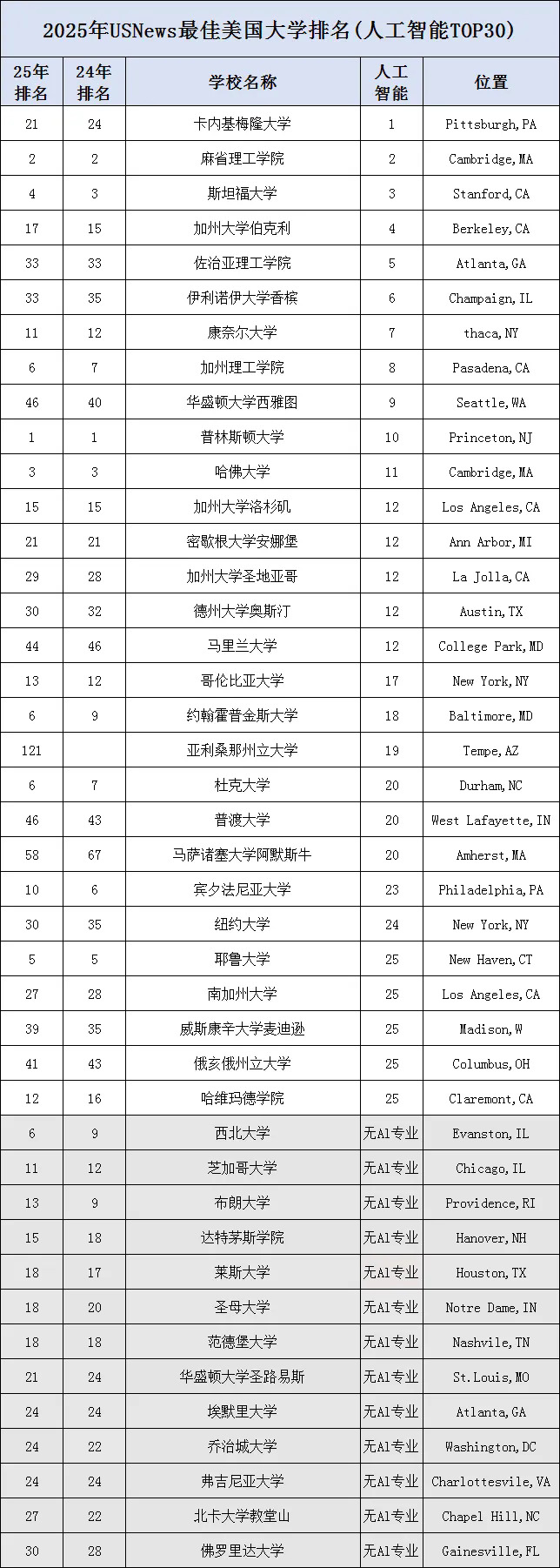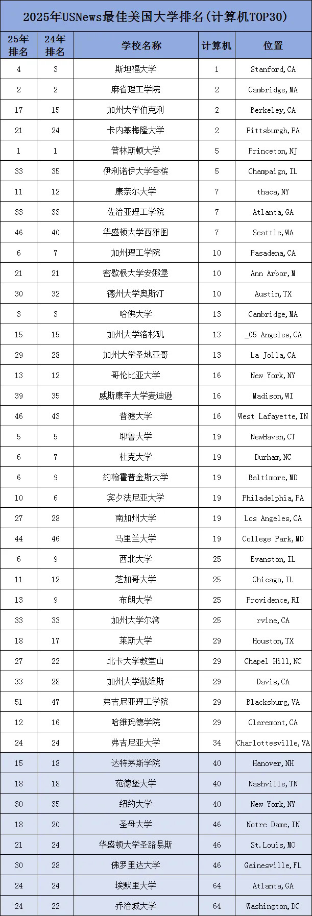 2025年U.S.News CS专业最强TOP30学校