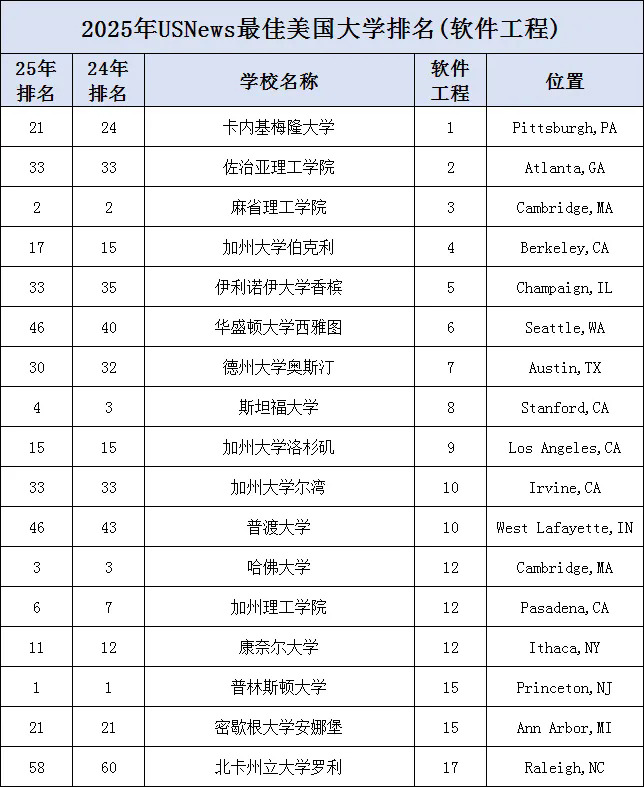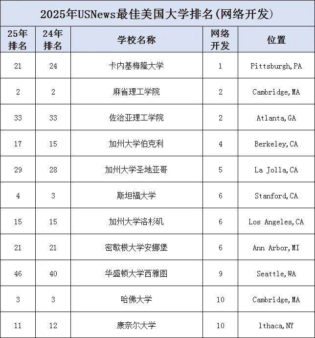 前10分别有CMU、佐治亚理工学院、MIT、UCB、UCSD、斯坦福、UCLA、密歇根大学安娜堡分校、华盛顿、康奈尔和哈佛。