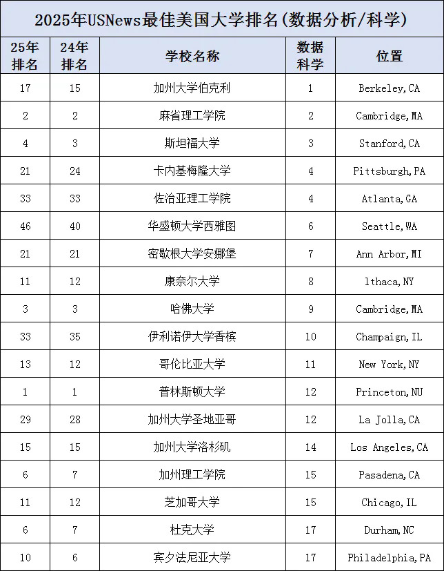 MIT、斯坦福、CMU、佐治亚理工学院、密歇根大学安娜堡分校、华盛顿、康奈尔、哈佛、UIUC等校的数据分析/科学实力都位列全美前10。