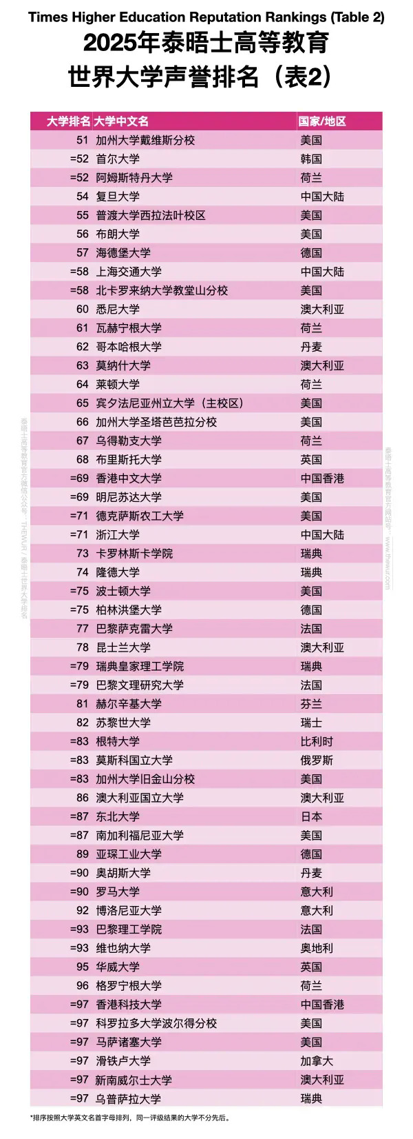 以上就是2025年泰晤士高等教育世界大学声誉排名详情,不同于大学排名,声誉排名可以更直观地了解到大学的国际声誉和影响力,帮助各位同学准确筛选学校!