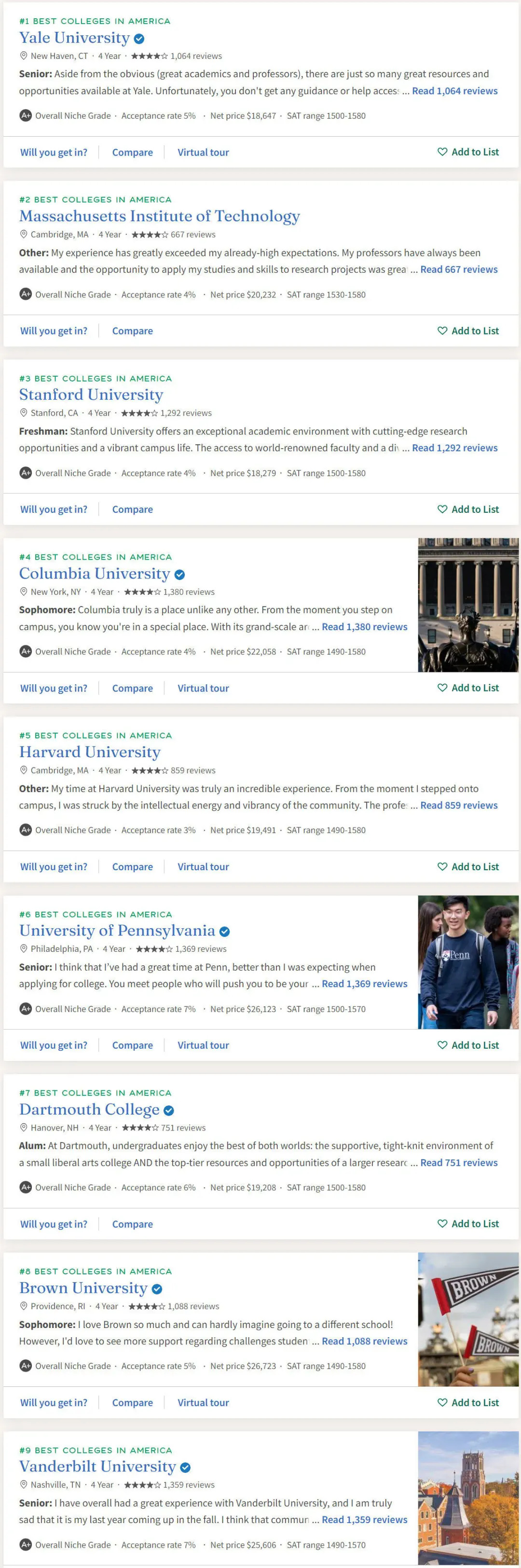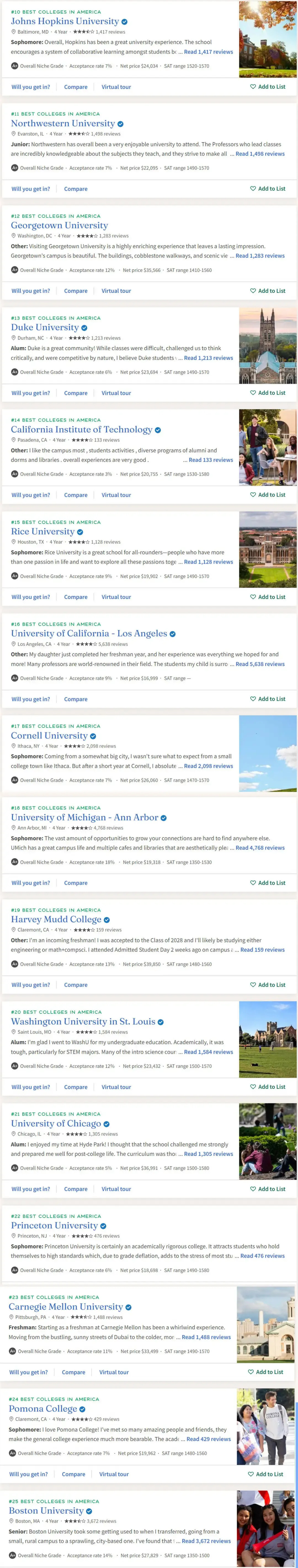 Niche2025全美最佳大学TOP50排名