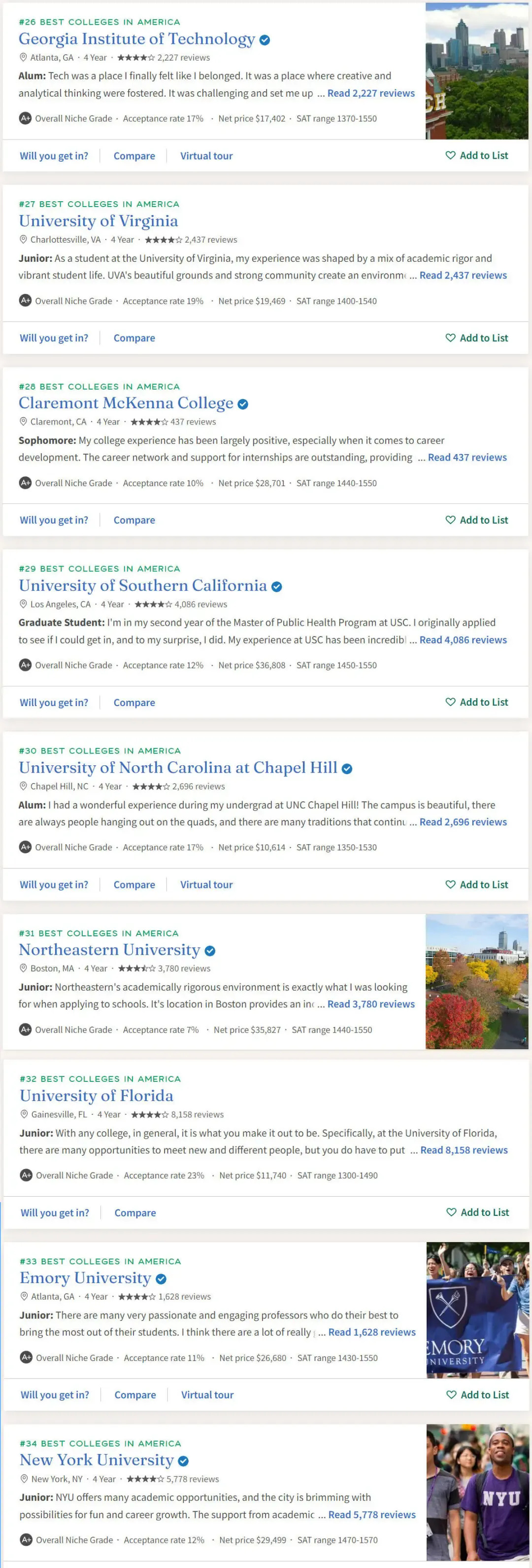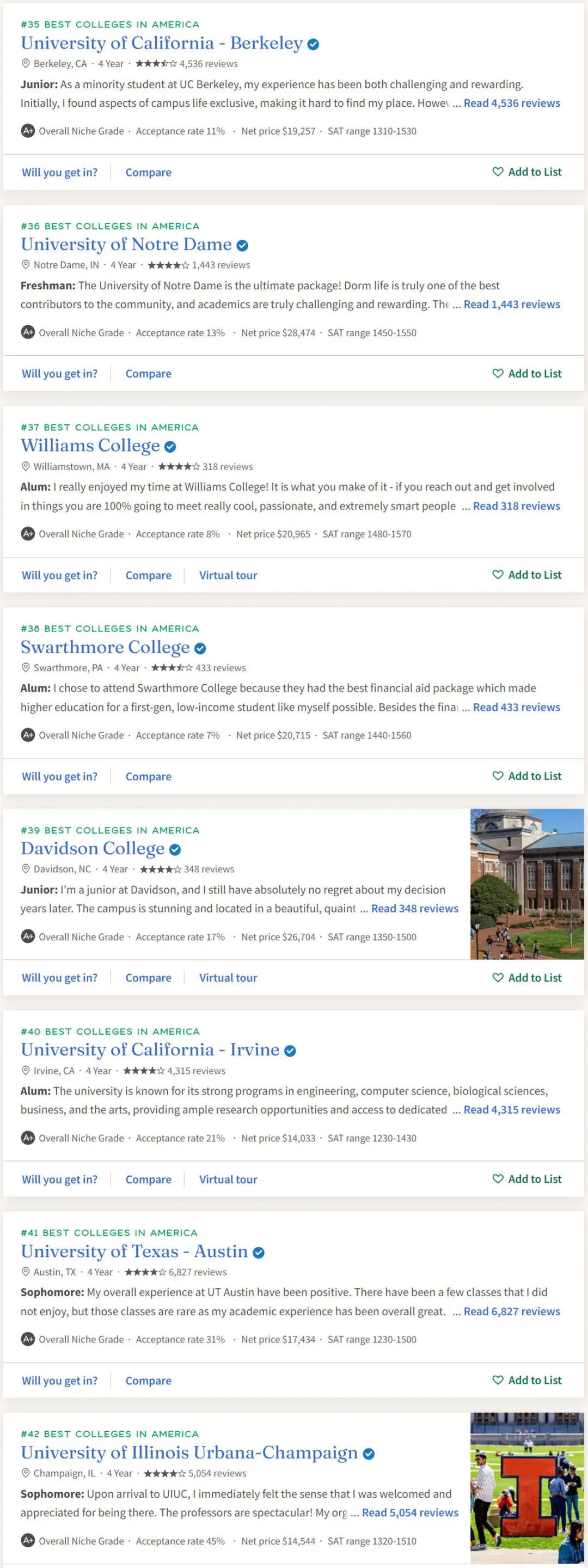 UC系统向来是国内同学申请的热门选择,UCLA(洛杉矶分校)和UCB(伯克利分校)这两位大哥总是在争谁才是UC第一,不过在Niche的排名中,UCLA(第16名)把UCB远远甩在了身后(第35名)。UCI(欧文分校)、UCSD(圣地亚哥分校)、UCD(戴维斯分校)也进入Top 50。
