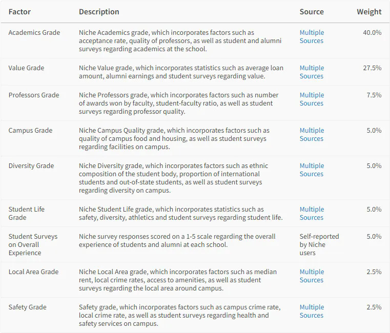 Niche排名的参考指标中,学术实力和性价比这两项占比近七成,说明该榜单十分看重大学的教育水准,以及能否为学生将来的职业发展提供帮助。