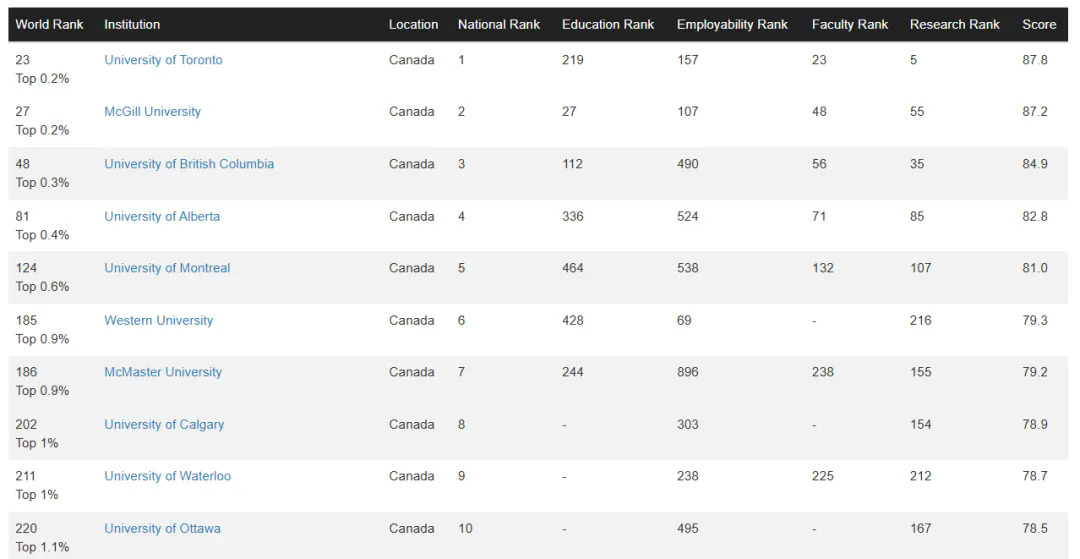 有四所大学进入全球前100,分别是:多伦多大学全球第23名;麦吉尔大学第27名;英属哥伦比亚大学(UBC)第48名;阿尔伯塔大学第81名。