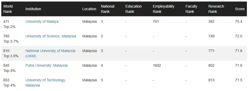 除了马大之外,今年入榜的另8所本地大学分别为:理科大学(第785名)、国立大学(第810名)、博特拉大学(第845名)、工艺大学(第853名)、玛拉工艺大学(第1,581名)、国际回教大学(第1,675名)、国油大学(第1,738名)及登嘉楼大学(第1,913名)。