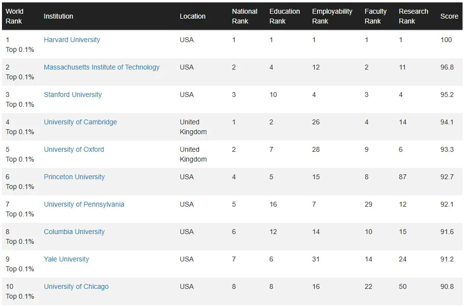 本次Top10排行依旧由英美高校占据,美国占了8所,英国占了2所。