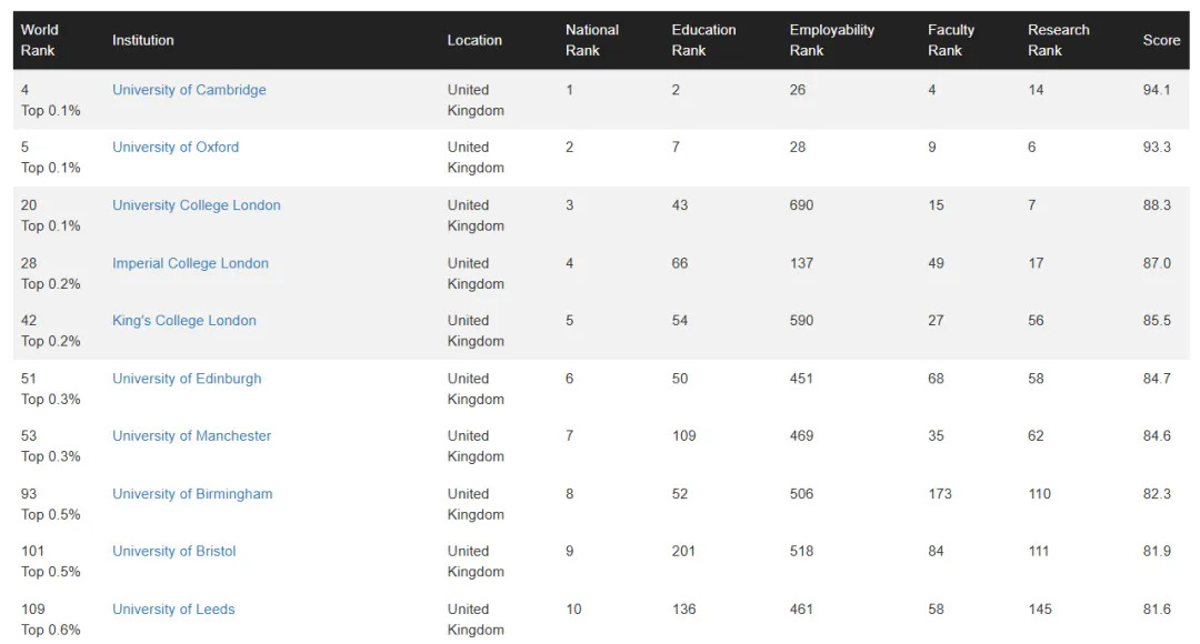 进入榜单前100的英国院校还有:帝国理工学院第28名,伦敦国王学院第42名,爱丁堡大学第51名,曼彻斯特大学第53名,伯明翰大学第93名。