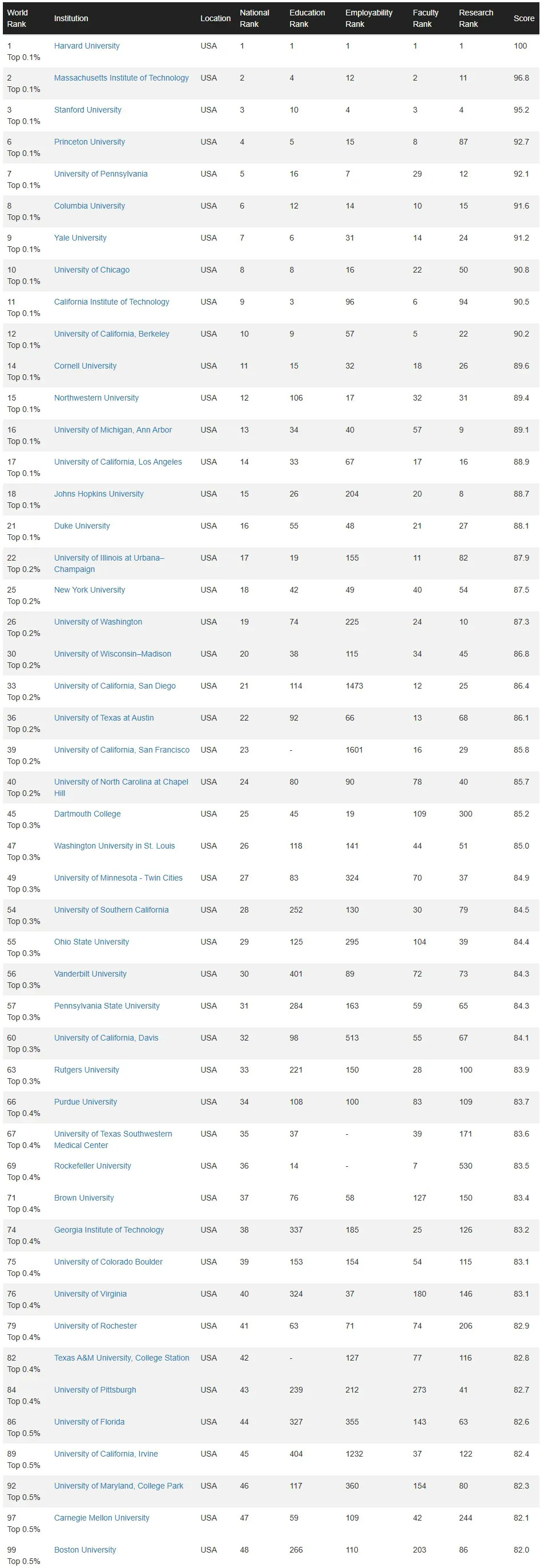 在本次排名中,美国院校依旧占有绝对优势:共319 所美国院校上榜,其中8所学校进入全球Top10,48 所院校位居全球Top100。