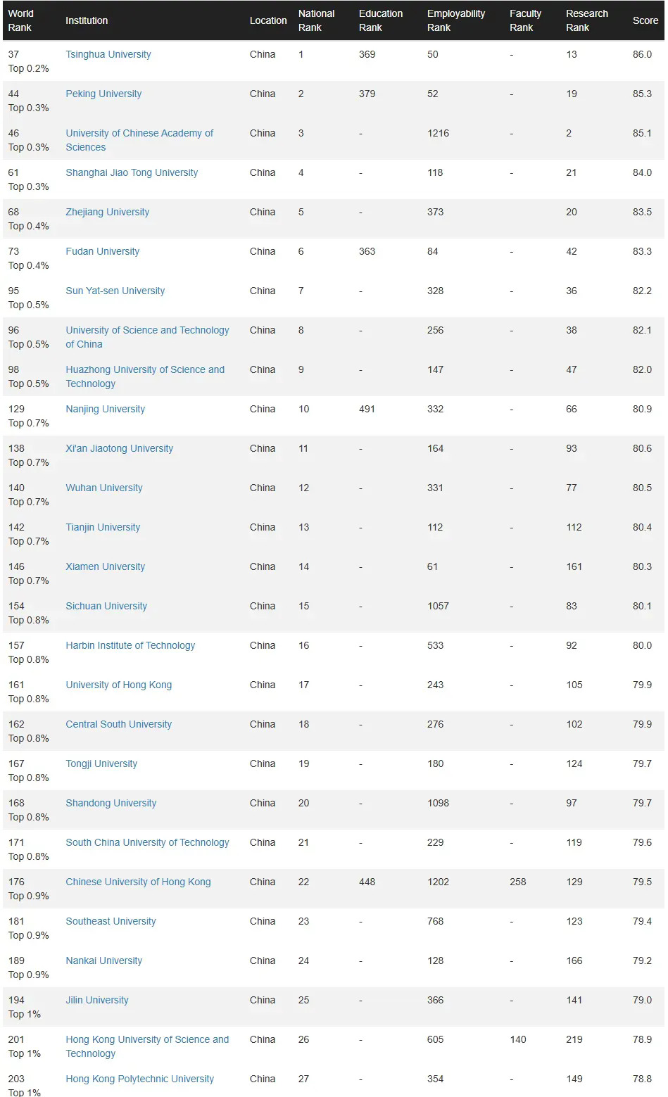 除此之外,中国香港地区依旧上榜7所:香港大学161名、香港中文大学176名、香港科技大学201名、香港理工大学203名、香港城市大学217名,香港浸会大学677名、香港教育大学1,272名;