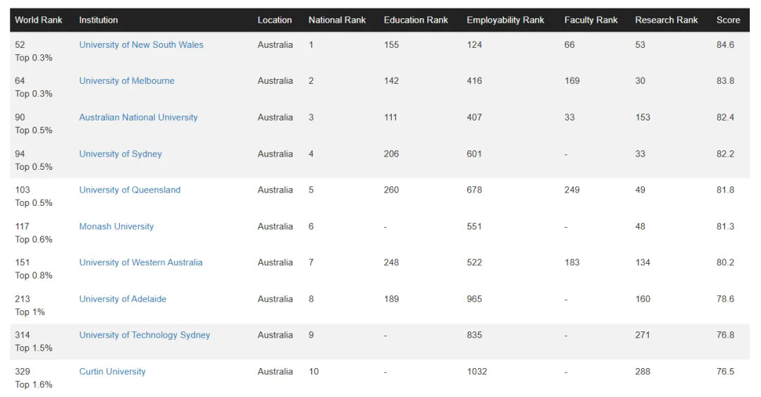 但最让人震惊的是,新南威尔士大学竟然一口气狂飙47名,直接冲上全球第52名,力压墨尔本大学(第64名),成为澳洲新晋No.1!