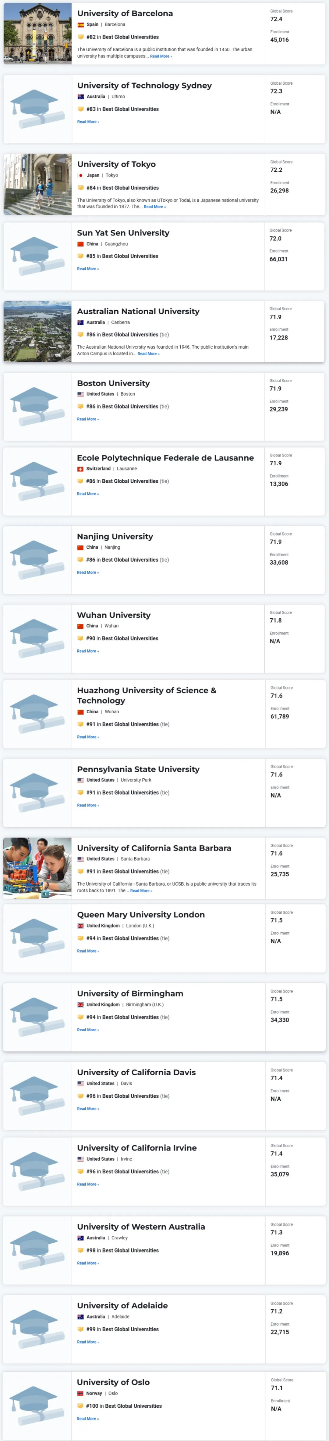 在最新发布的 U.S. News 全球最佳院校排名里,全球共有 2250 所高校上榜。与往年的排名情况相比,国内高校的上榜数量有了明显增长。这一变化反映出中国大学愈发重视学术质量,同时在全球范围内的学术表现也正逐步提升。