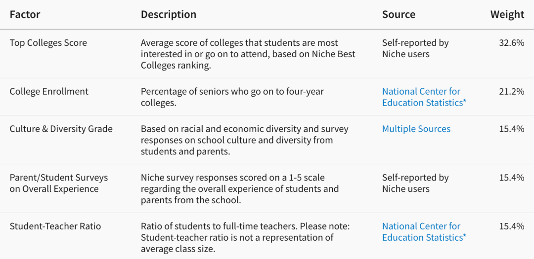 今年Niche的排名指标有所调整,删掉了“SAT/ACT总分”这一指标,同时提高了其他指标的权重:
