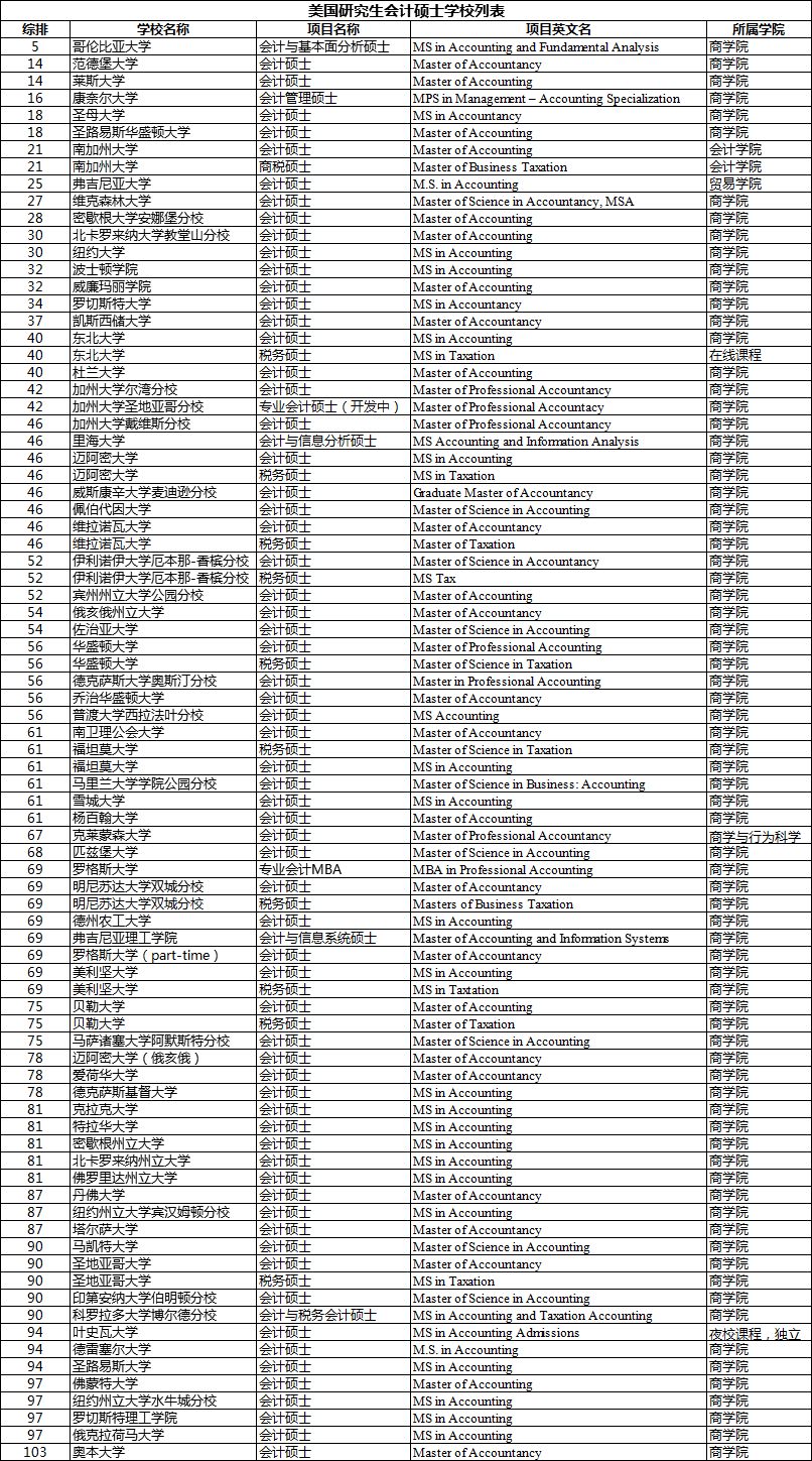 在美国大学里,会计硕士项目通常被称为 Master of Sciencein Accounting/Accountancy, 简 称 MACC 或 者 MSA。与 MBA会计方向的项目相比,MACC 并不侧重培养日后可以 transfer到其他领域的综合商业技能,而是以充实专业知识、最终通过 Certified Public Accountant 考试(简称 CPA)为核心的培养目标。美国会计体系和中国使用的不一样。美国是用American System,中国用的是 International Standard,区别在于相关法律、制度及其建立的过程。MACC 项目下通常有若干个分支,包括公共会计、管理会计、政府会计、内部审计、保险、税务等。主要课程包括:管理会计、审计、中级财务会计、会计信息系统、成本管理等,项目通常为 30 个学分。大部分学校都将学制设置为一年,对于本科为非会计背景的学生,也可能持续一年半到两年。