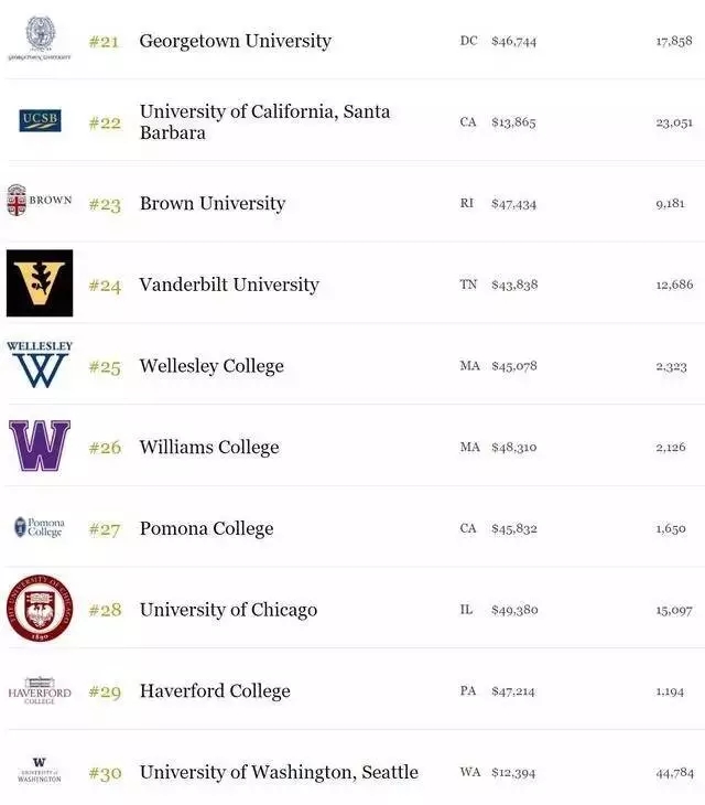 学生毕业后的薪水回报(alumni earnings):20%。根据PayScale数据库和联邦教育部数据库的数据,福布斯统计了毕业生在职业中期(至少工作10年)的薪水水平。PayScale数据库是全球最大的薪酬数据库,但是其中的数据都是自我报告的。教育部的数据库则是基于联邦收入的退税情况统计。所以,这两个平台的数据都不是完美的,因此福布斯通过自己的公式计算出最终的校友收入结果。