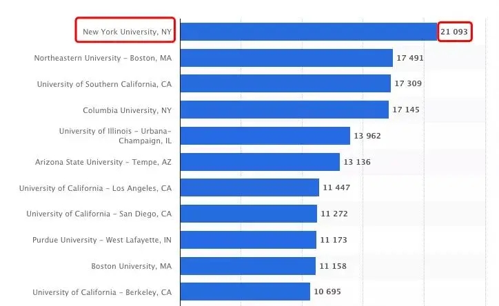 常年在排名30名左右徘徊的综合大学排名、优越的地理位置,这些因素吸引着国际生们,让NYU的国际生比例维持在22%左右,放眼美国Top50大学,没有能跟NYU这个数据有一拼的,在国际生总量上,NYU更是排名全美第一。