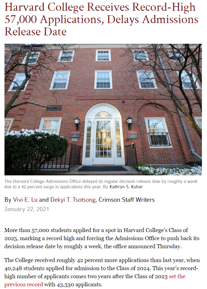 哈佛大学招生办公室周四宣布,超过5.7万名学生在今年申请了哈佛大学!创下了历史新高同时,也迫使招生办公室将公布决定的日期推迟了大约一周。