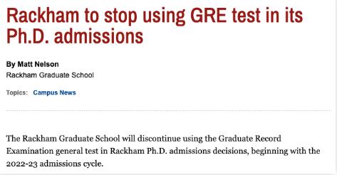 近日,密歇根大学拉克哈姆Rackham研究生院宣布,从2022-2023申请季开始,该校博士专业申请中,申请人不再需要提交GRE成绩。