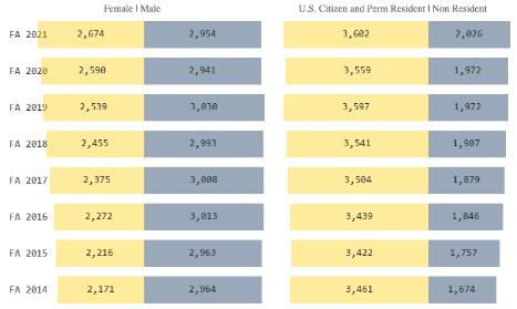 上图是密歇根大学Rackham研究生院管理的所有博士专业学生构成,从2014年至2021年,博士生中的女性和国际学生数量保持较为稳定的上升。